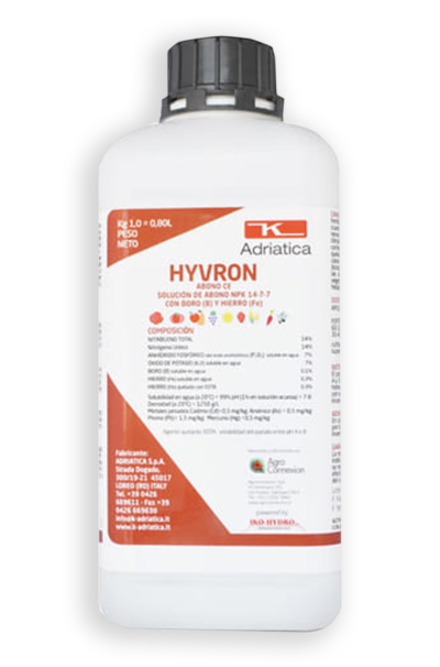 Hyvron® es un fertilizante líquido, recomendado para todos los cultivos en fase de reactivación vegetativa, después del receso invernal. La distribución equilibrada de sus elementos nutritivos, hacen de Hyvron® un fertilizante particularmente indicado para fisiopatías nutricionales, sobre todo en vid, cerezos, durazneros, olivos, almendros y hortalizas en general, especialmente las de hoja verde. Hyvron® favorece una rápida reactivación vegetativa en los cultivos dañados por enfermedades, plagas o agentes climáticos adversos.